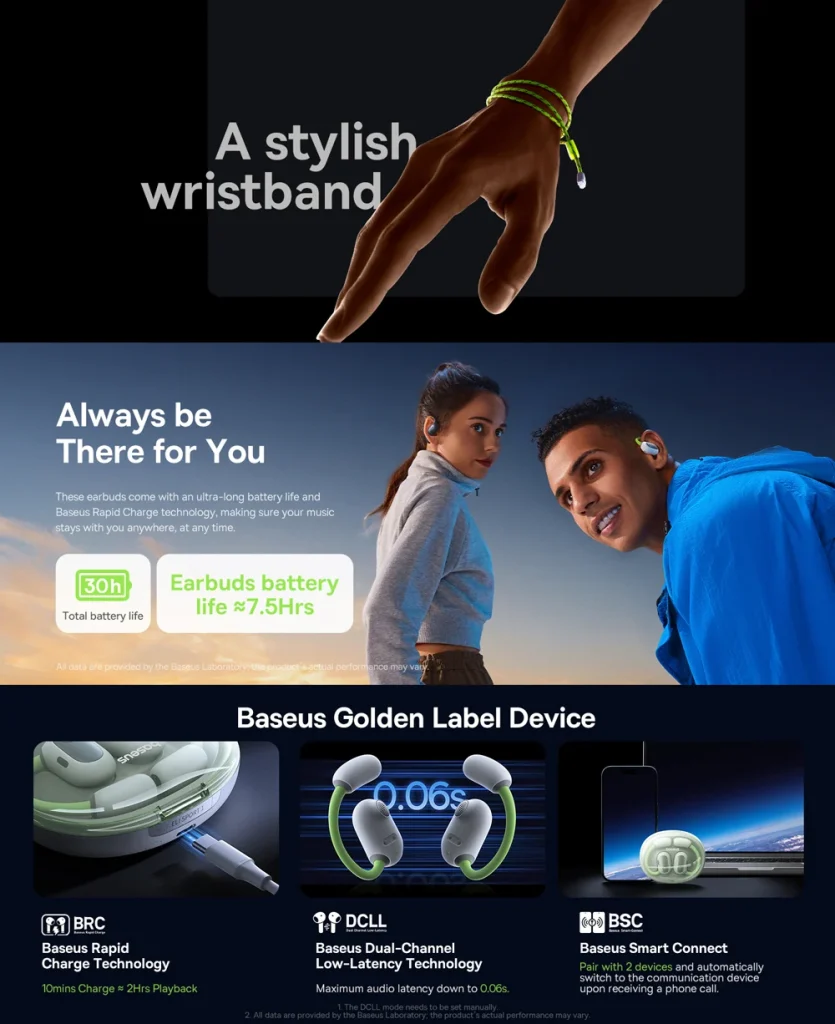 หูฟังไร้สาย Baseus Eli Sport 1 แบบ Open Ear สามารถใช้งานได้สูงสุด 7.5 ชั่วโมง และสูงสุด 30 ชั่วโมงเมื่อใช้งานร่วมกับเคสชาร์จ ด้วยคุณสมบัติการชาร์จด่วนทำให้ฟังเพลงได้ภายใน 1 ชั่วโมง ทำให้ใช้งานได้ตลอดทั้งวันและต่อเนื่องยาวนาน