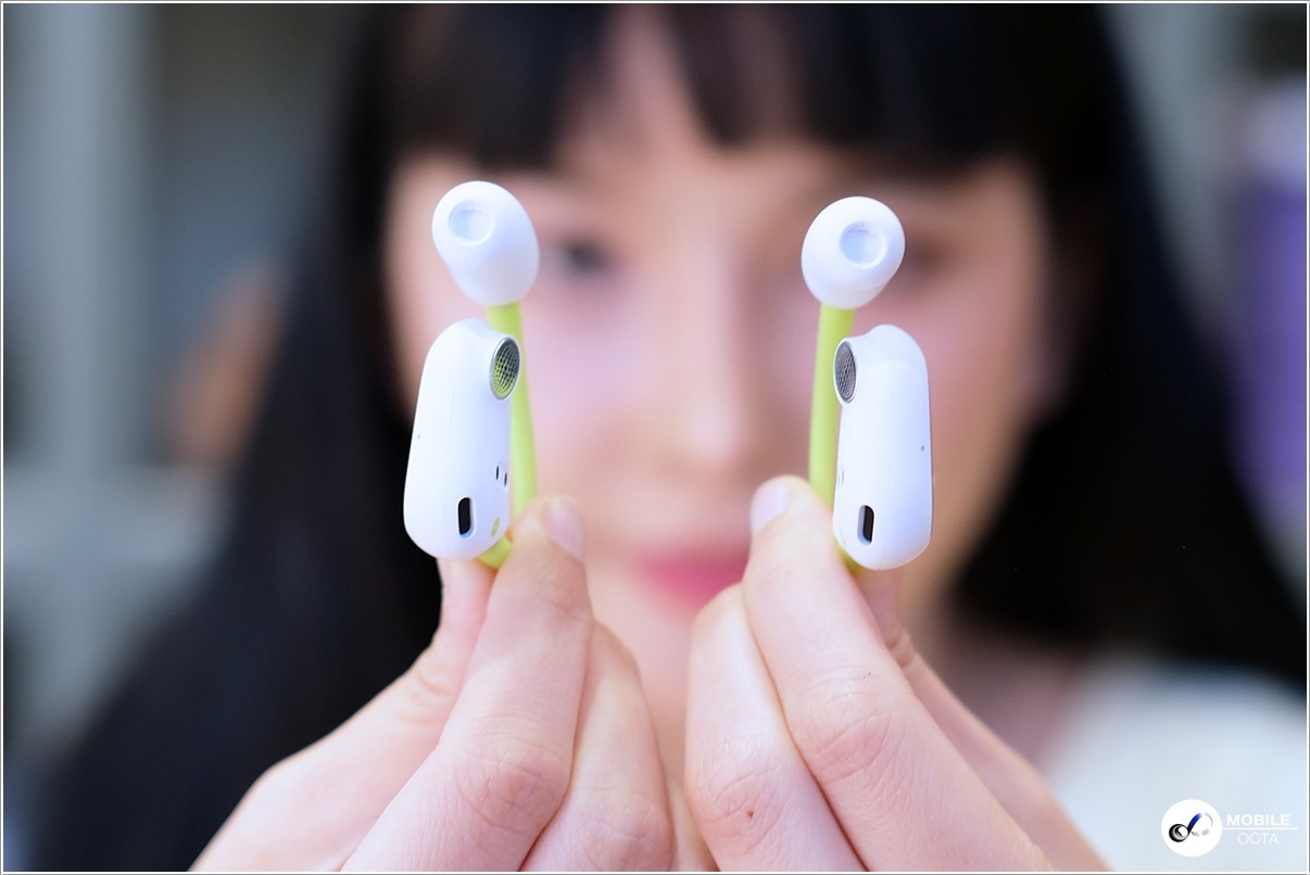 ตัวหูฟังแต่ละข้างจะมีช่องลำโพง, ช่องไมโครโฟน, แถบไฟ LED แสดงสถานะการเชื่อมต่อ, ตัวอักษร L กับ R เพื่อบ่งบอกข้างของหูฟัง และช่องต่อสายคล้องคอ