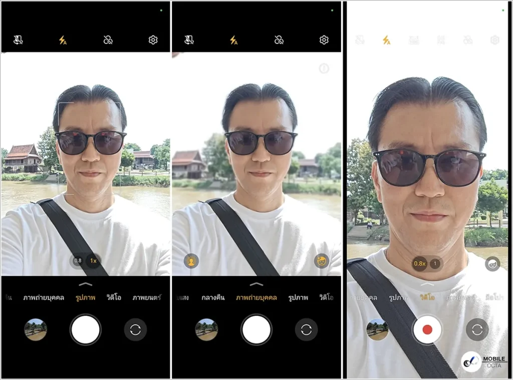 และถ้าเปิดใช้งานกล้องถ่ายภาพด้วย Flex Mode ที่แบ่งหน้าจอเป็น 2 ส่วนก็สามารถตั้งถ่ายภาพได้ในหลากหลายมุมมอง จะตั้งเครื่องแล้วกางจอขึ้นไปเพื่อให้ได้มุม Ant eye view ก็สามารถเลือกปรับ Viewfinder ให้อยู่ที่หน้าจอส่วนไหนก็ได้ โดยจอด้านบนก็จะจอของกล้อง ส่วนจอด้านล่างด้านซ้ายเป็นภาพจากกล้องที่เพิ่งถ่ายไป และด้านขวามีปุ่มควบคุมใช้งานกล้องต่างๆ ถือเป็นอีกมิติของการถ่ายภาพมือถือเลยทีเดียว