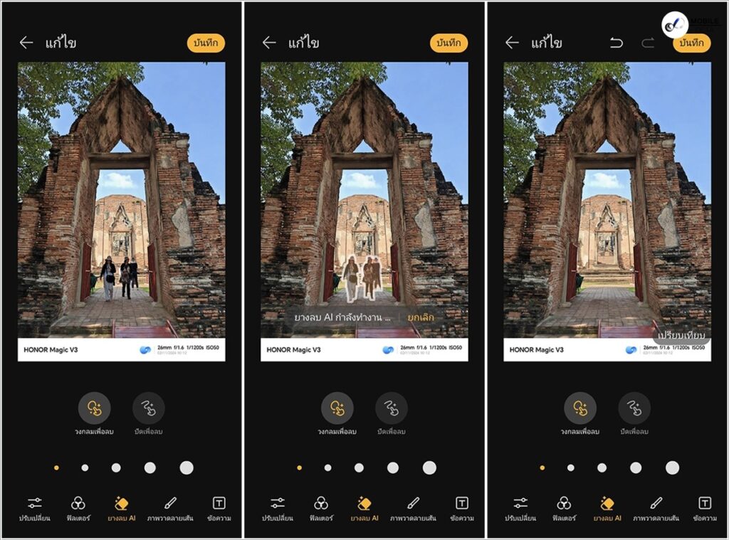 HONOR Magic V3 ยังมาพร้อม HONOR AI Eraser (ยางลบ AI) ฟีเจอร์การแก้ไขรูปภาพ ด้วยการใช้เทคโนโลยี Generative AI ขั้นสูงของ HONOR และผสมผสาน AI เทคโนโลยีจาก Google เพื่อกำจัดองค์ประกอบของรูปภาพที่ไม่ต้องการ เพื่อให้ได้ภาพถ่ายที่คุณต้องการ รวมตกแต่งภาพพื้นหลังได้ง่าย ๆ พร้อมแชร์ได้เลย