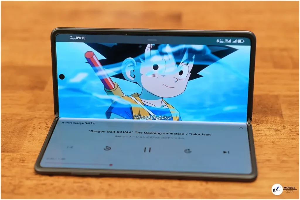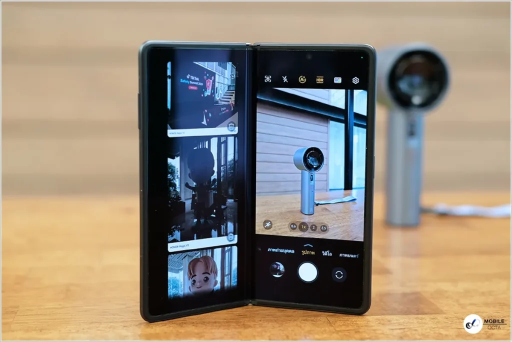 อีกหนึ่งความสามารถเด่นของ HONOR Magic V3 ก็คือ สามารถปรับระดับของหน้าจอได้หลากหลายไม่เพียงแค่พับกับกางเท่านั้น ซึ่งถ้ากางจอออกมาสักครึ่งหนึ่งประมาณ 90-120 องศาก็สามารถวางบนโต๊ะใช้งานเหมือนแล็บท็อปได้ แต่พิเศษกว่าตรงที่เหมือนมี 2 หน้าจอ เช่น ถ้าเราเปิด YouTube แล้วพับจอเข้าหากัน หน้าจอบนจะเป็นวิดีโอ ส่วนหน้าจอล่างก็จะเป็นส่วนของคอมเมนต์หรือความคิดเห็นให้อ่านไปพร้อมกันได้