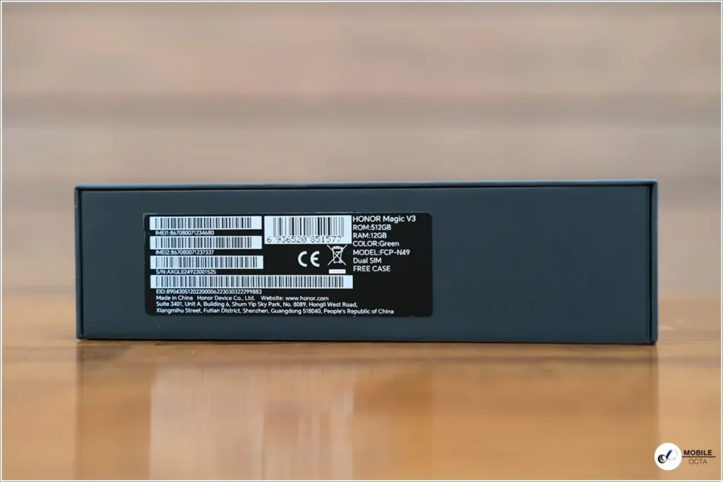 กล่องแพคเกจจิ้งของ HONOR Magic V3 เป็นกล่องกระดาษแข็งสีดำขนาดใหญ่ ด้านหน้ากล่องสลักชื่อรุ่นสีเงิน และด้านท้ายกล่องมีเลขอีมี่ ขนาดหน่วยความจำ สีตัวเครื่อง และสถานที่ผลิต