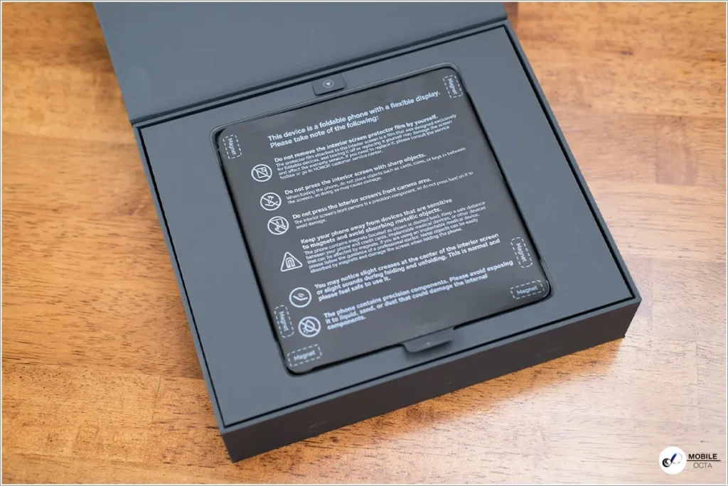 ขณะที่หน้าจอหลักด้านในแบบ Foldable LTPO AMOLED ความละเอียด 2344×2156 พิกเซล ขนาด 7.92 นิ้ว ในอัตราส่วน 9.78:9, รองรับ 1.07 พันล้านสี, ขอบเขตสีแบบ DCI-P3 โดยมีอัตรารีเฟรชเรท 120Hz, รองรับ HDR10+ และความสว่างสูงสุด 1800 nits และครอบทับด้วยกระจกกันรอย King Kong Rhinoceros