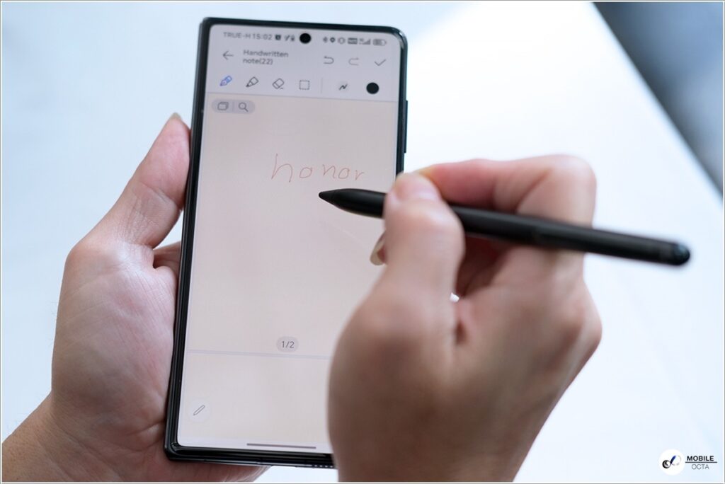 HONOR Magic V3 ยังรองรับ HONOR Magic Pen ด้วยไว้ให้ขีดเขียนวาดรูปได้ โดยมีแอปที่รองรับพร้อมใช้งานได้เลยไม่ต้องดาวน์โหลดใหม่ให้เสียเวลา เหมาะกับสายทำงานที่ต้องจดบันทึก หรือเซ็นอะไรจบได้ในเครื่องนี้เลย
