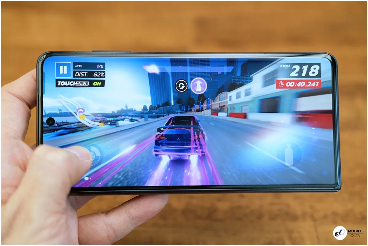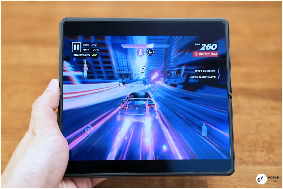 เริ่มที่ Asphalt 9 เกมแข่งรถที่มีภาพสุดสวยกันก่อน โดยตั้งค่าคุณภาพภาพระดับสูง ซึ่งถ้าเล่นด้านหน้าจอแสดงผลก็จะเห็นมุมมองที่กว้างแบบชัดเจน ทำให้เห็นได้เยอะ แต่จะเห็นรถยนต์คันเล็ก ขณะที่ถ้าเล่นบนหน้าจอแสดงผลด้านในที่กางหน้าจอออกมาก็จะเป็นอีกสัดส่วนหนึ่งเห็นรถยนต์ขนาดใหญ่ แต่ฉากในเกมจะเล็กลง โดยรวมแล้วสามารถเล่นได้ลื่นไหลดีมาก และสามารถสลับสลับไปเล่นในแบบหน้าจอหลักหรือจอนอกได้แบบทันทีโดยที่ไม่ต้องกดออกจากเกม