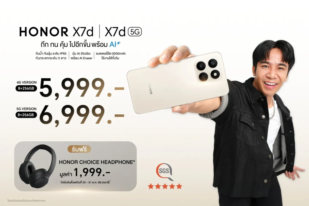ทั้งนี้ HONOR X7d 5G (8+256GB) มีทั้งหมด 3 สี ได้แก่ Desert Gold (สีทองทะเลทราย), Meteor Sliver (สีเงินดาวตก) และ Velvet Black (สีดำกำมะหยี่) ราคา 6,999 บาท ซื้อสินค้าได้ที่ HONOR Experience Store ทุกสาขา ร้านค้าตัวแทนจำหน่ายทั่วประเทศ และช่องทางออนไลน์ชั้นนำ Shopee: https://th.shp.ee/mbMgXtJ