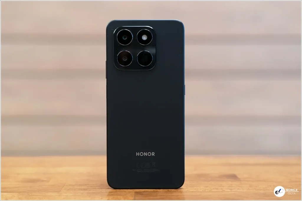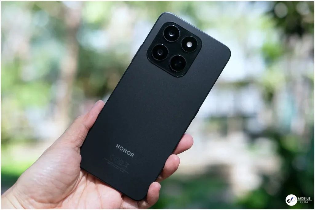 ด้านหลังเครื่องมาในพื้นผิวสัมผัสแบบด้านช่วยลดรอยนิ้วมือได้ดี และมีโลโก้ HONOR อยู่บริเวณตรงกลางด้านล่าง โดยมุมซ้ายด้านบนมีโมดูลกล้อง ที่ภายในมีเลนส์กล้องหลักความละเอียด 108 ล้านพิกเซล กับเลนส์เสริม และไฟแฟลช LED