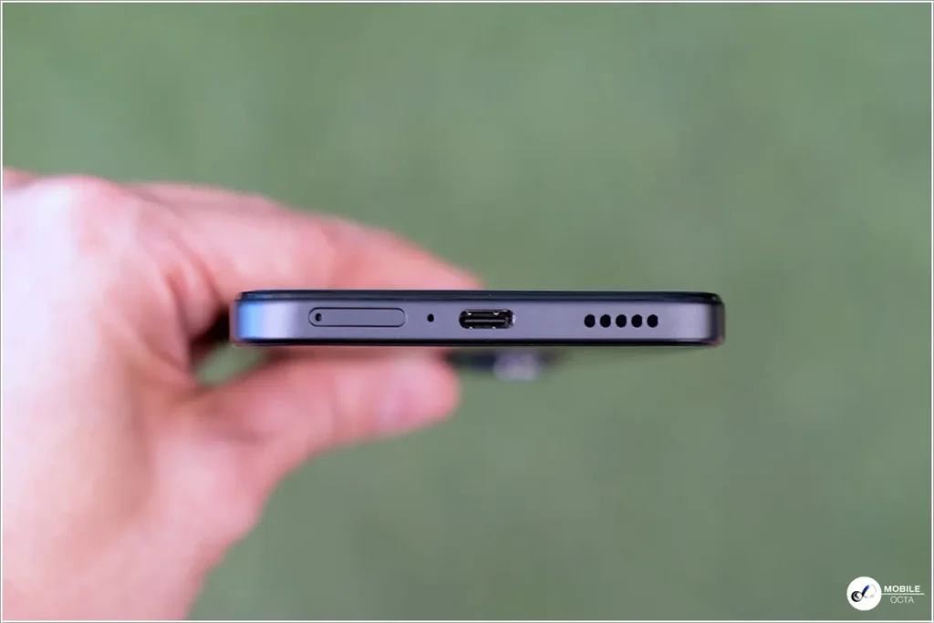 ด้านท้ายเครื่องมีช่องใส่ซิมการ์ด, ช่องไมโครโฟนสำหรับสนทนา, พอร์ต USB Type-C สำหรับชาร์จและถ่ายโอนข้อมูล และช่องลำโพงเสียง