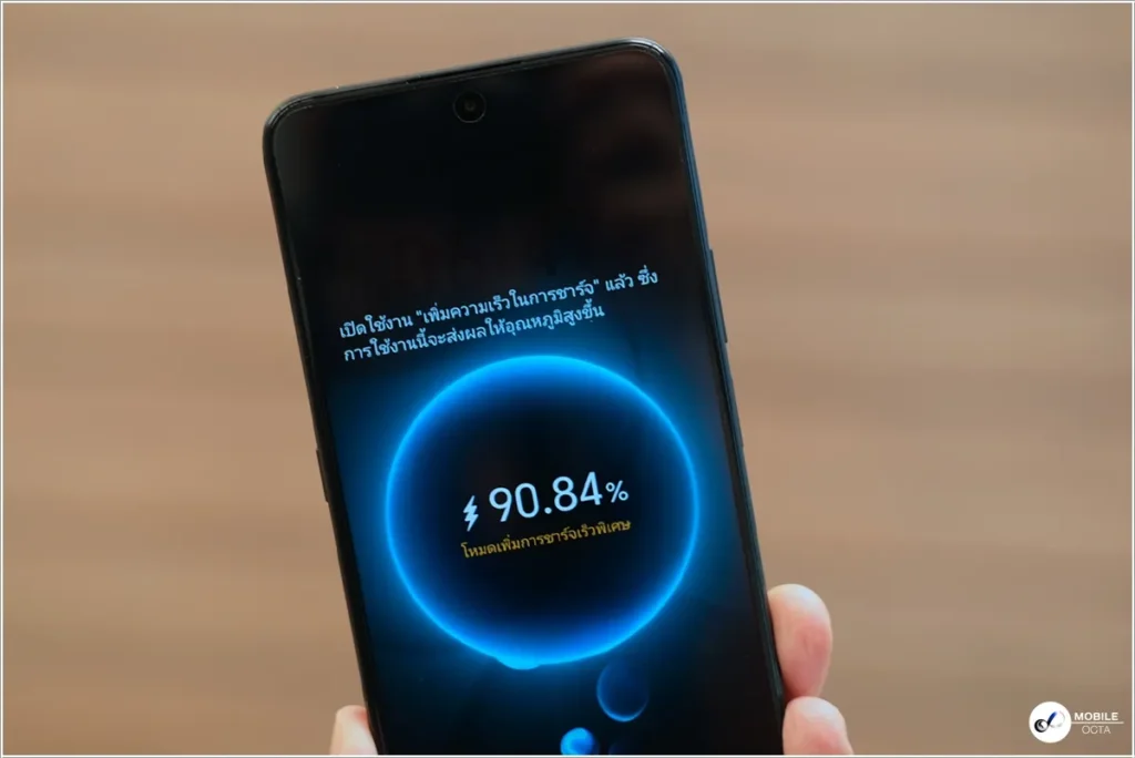 - ระยะเวลาชาร์จ: ด้วยแบตเตอรี่ที่ใหญ่มาก แต่ให้ชาร์จไว 35W อาจใช้เวลาชาร์จเต็ม (0-100%) นานกว่า 1 ชั่วโมงเล็กน้อย