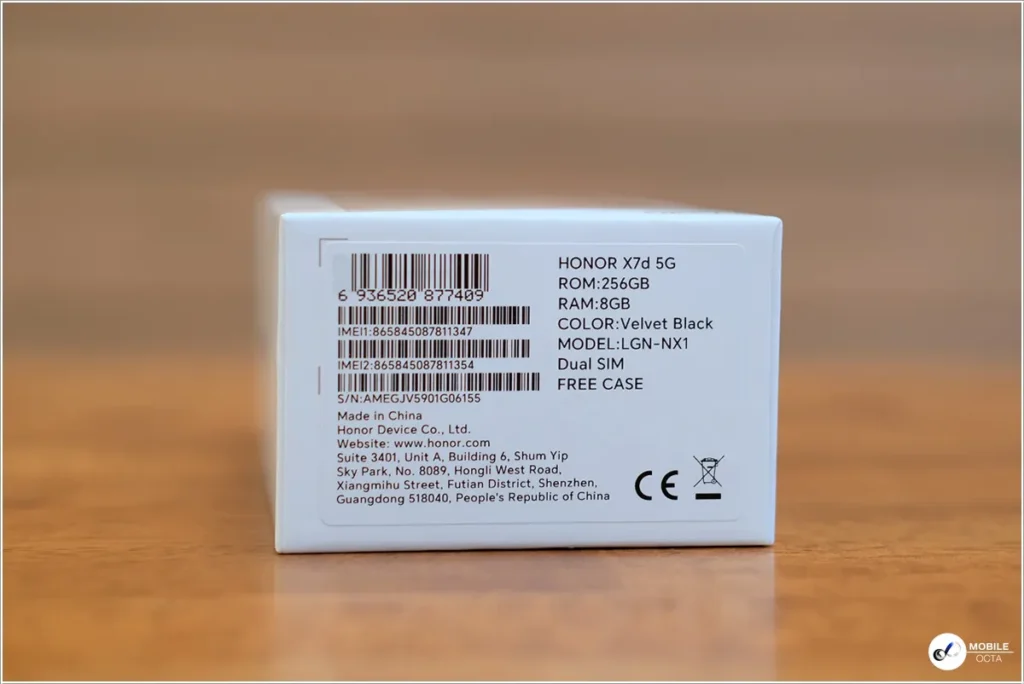 กล่องแพคเกจจิ้งของ HONOR X7b 5G เป็นกล่องกระดาษแข็งสีขาวขนาดพอดีกับตัวเครื่อง ด้านหน้ากล่องมีภาพตัวเครื่องด้านหลังพร้อมชื่อรุ่นขนาดใหญ่ และมีข้อความรองรับการเชื่อมต่อ NFC อยู่มุมขวาด้านล่าง ส่วนด้านข้างกล่องทั้ง 2 ด้านก็มีชื่อรุ่น และด้านท้ายกล่องมีเลขอีมี่ ขนาดหน่วยความจำ สีตัวเครื่อง และสถานที่ผลิต