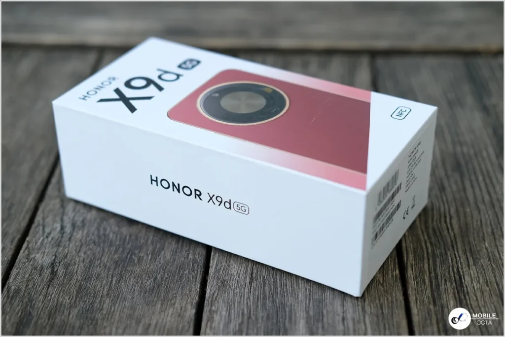 กล่องแพคเกจจิ้งของ HONOR X9d 5G เป็นกล่องกระดาษแข็งสีขาวขนาดพอดีกับตัวเครื่อง ด้านหน้ากล่องมีภาพตัวเครื่องด้านหลังพร้อมชื่อรุ่นขนาดใหญ่อยู่ด้านบน และมุมขวาด้านล่างมีข้อความระบุว่ารองรับการเชื่อมต่อ NFC