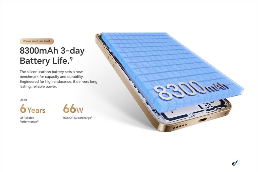 ตัวเครื่องมาพร้อมเทคโนโลยีจัดการพลังงานอัจฉริยะ และอัลกอริธึมต้านการเสื่อมสภาพแบตเตอรี่ ที่พัฒนาโดย HONOR สามารถควบคุมรอบการชาร์จและกระจายความร้อนอย่างมีประสิทธิภาพ ช่วยรักษาสมรรถนะของแบตเตอรี่ให้อยู่ได้นานสูงสุดถึง 6 ปี