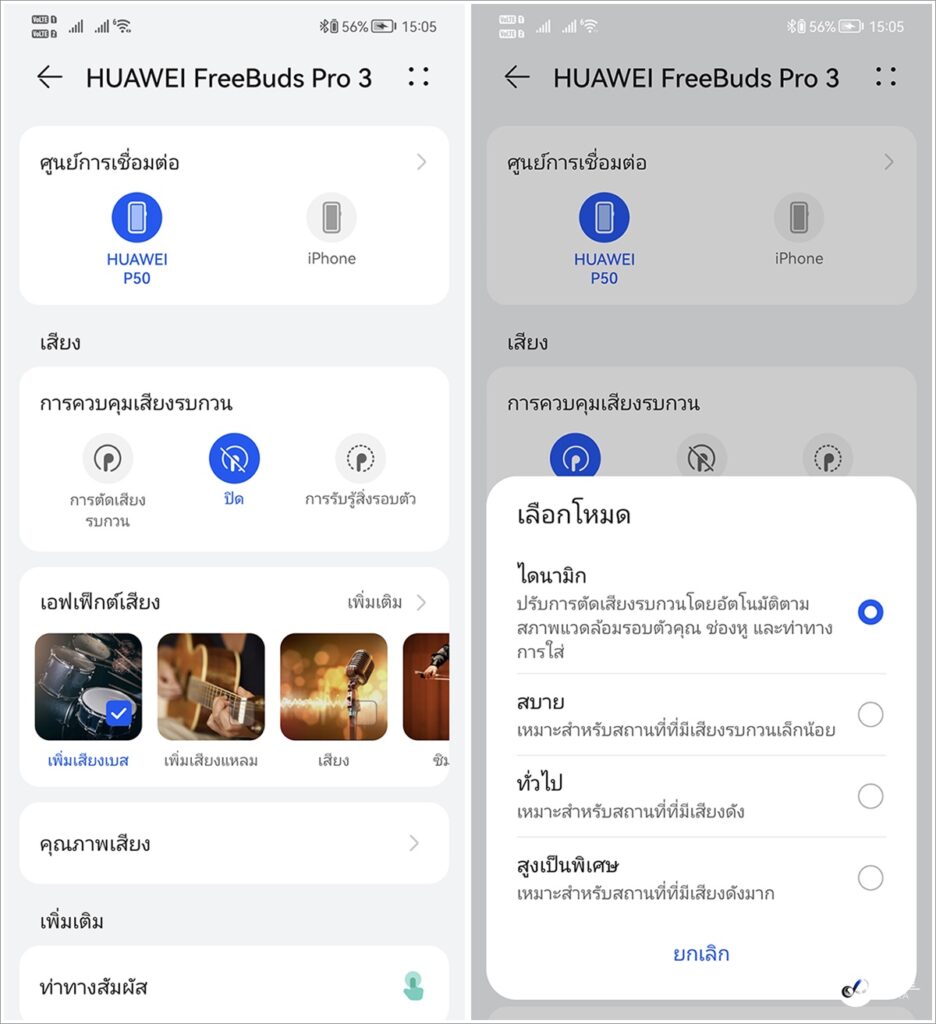 โดยโหมดการตัดเสียงรบกวนสามารถเลือกได้ 4 โหมดย่อยคือ ไดนามิก, สะดวกสบาย, ทั่วไป และพิเศษ