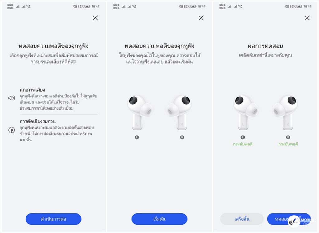 นอกจากนี้ยังสามารถตั้งค่าเพิ่มเติมทั้งการทดสอบความพอดีของจุกหูฟัง เพื่อเลือกจุกหูฟังที่เหมาะสมเพื่อให้ได้ประสิทธิภาพเสียงที่ดีที่สุดได้
