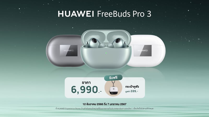 ทั้งนี้ HUAWEI FreeBuds Pro 3 ราคา 6,990 บาท มีให้เลือก 3 สีคือ สีเขียว Green, สีเงิน Silver Frost และสีขาว Ceramic White รับฟรี กระเป๋าหูฟัง มูลค่า 599 บาท เมื่อสั่งซื้อตั้งแต่วันที่ 12 ธันวาคม 2566 ถึง 7 มกราคม 2567