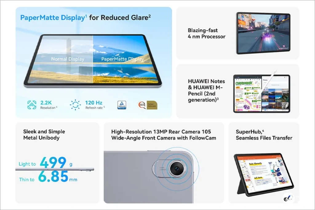 และสบายตาด้วยหน้าจอแบบด้าน หรือที่หัวเว่ยเรียกว่า PaperMatte ช่วยลดแสงสะท้อนอย่างมีประสิทธิภาพ ทำงานเร็วลื่นด้วยชิปเซ็ตตัวแรงจาก Qualcomm บนระบบปฏิบัติการ HarmonyOS ลื่นๆ และใช้งานแอปทำงาน Office อย่างเช่น WPS และ HUAWEI Notes การันตีการทำงานร่วมกับ M-Pencil Gen 2 ได้เป็นอย่างดี