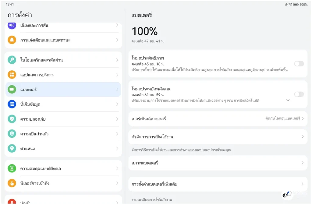 ทางด้านแบตเตอรี่ของ HUAWEI MatePad 11.5 PaperMatte Edition จะให้มาที่ 7700mAh จากที่เราทดสอบมาถือว่าค่อนข้างอึดทีเดียวครับ สามารถเล่นวีดีโอต่อเนื่องได้เกิน 10 ชั่วโมง หรือสำหรับการประชุมออนไลน์ก็ทำได้เกิน 6 ชั่วโมง ถือว่าเยอะพอตัวสำหรับการประชุมที่ลากยาวครึ่งวันก็ถือว่าไม่ธรรมดา ส่วนการชาร์จแบตจะรองรับการชาร์จเร็วที่ 20W ที่อยู่ในระดับพอใช้ได้สำหรับอุปกรณ์ยุค 2024 ครับ