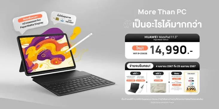 โปรโมชัน Early Bird สำหรับ HUAWEI MatePad 11.5 PaperMatte Edtion ในราคา 14,990 บาท พร้อมรับฟรี ปากกา HUAWEI-M Pencil รุ่นที่ 2 มูลค่า 4,490 บาท เคสคีย์บอร์ด HUAWEI Smart Keyboard มูลค่า 4,990 บาท กล่องเก็บของแบบพับได้ มูลค่า 1,990 บาท และบริการตรวจวัดสายตาฟรีที่ THE NEXT มูลค่า 300 บาท
