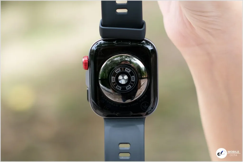 ส่วนด้านหลังใช้วัสดุผสมใยพอลิเมอร์มีพื้นผิวสีดำเงา ตรงกลางเป็นตำแหน่งของเซ็นเซอร์ติดตามสุขภาพต่างๆ ที่เอาไว้ใช้วัดอัตราการเต้นของหัวใจ ค่าออกซิเจนในเลือด อุณหภูมิของผิวหนัง สุขภาวะทางอารมณ์ ค่าความเครียด รวมถึงคุณภาพการหลับนอน