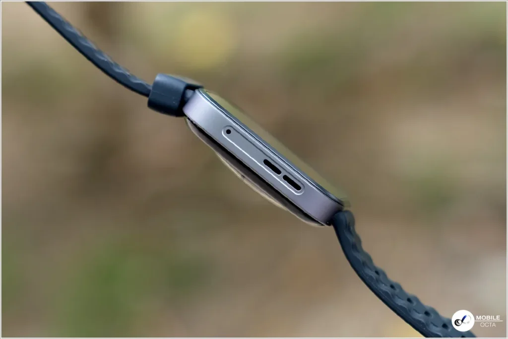 ส่วนด้านซ้ายข้างตัวเรือน มีช่องลำโพง และช่องไมโครโฟน สำหรับการสนทนาผ่าน Bluetooth เมื่อจับคู่กับสมาร์ทโฟน