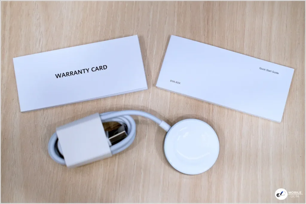 เมื่อแกะกล่องออกมาก็จะพบกับตัว HUAWEI Watch FIT 4 Pro, แท่นชาร์จพร้อมสายชาร์จ, คู่มือเริ่มต้นใช้งานฉบับย่อ, คู่มือความปลอดภัย และใบรับประกัน