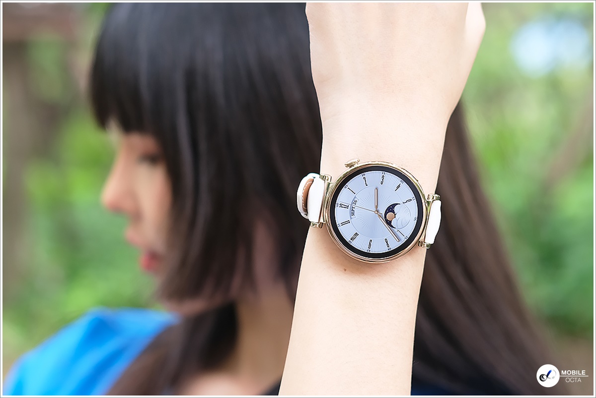 HUAWEI WATCH GT 4 ขนาด 41 มม.ได้รับการออกแบบให้ทันสมัยเพรียวบางและสมดุลด้วยการออกแบบจี้เหมือนเครื่องประดับ กรอบนอกสีทองเพิ่มความเย้ายวนใจให้กับรูปลักษณ์โดยรวมของหน้าปัดนาฬิกา สร้างลุคที่สะดุดตาและดูเรียบง่ายคล้ายกับเครื่องประดับและเครื่องประดับอันโอ่อ่า องค์ประกอบการออกแบบนี้เป็นเครื่องพิสูจน์ที่เป็นเอกลักษณ์ในการบูรณาการความสามัคคีของรูปแบบและฟังก์ชั่น