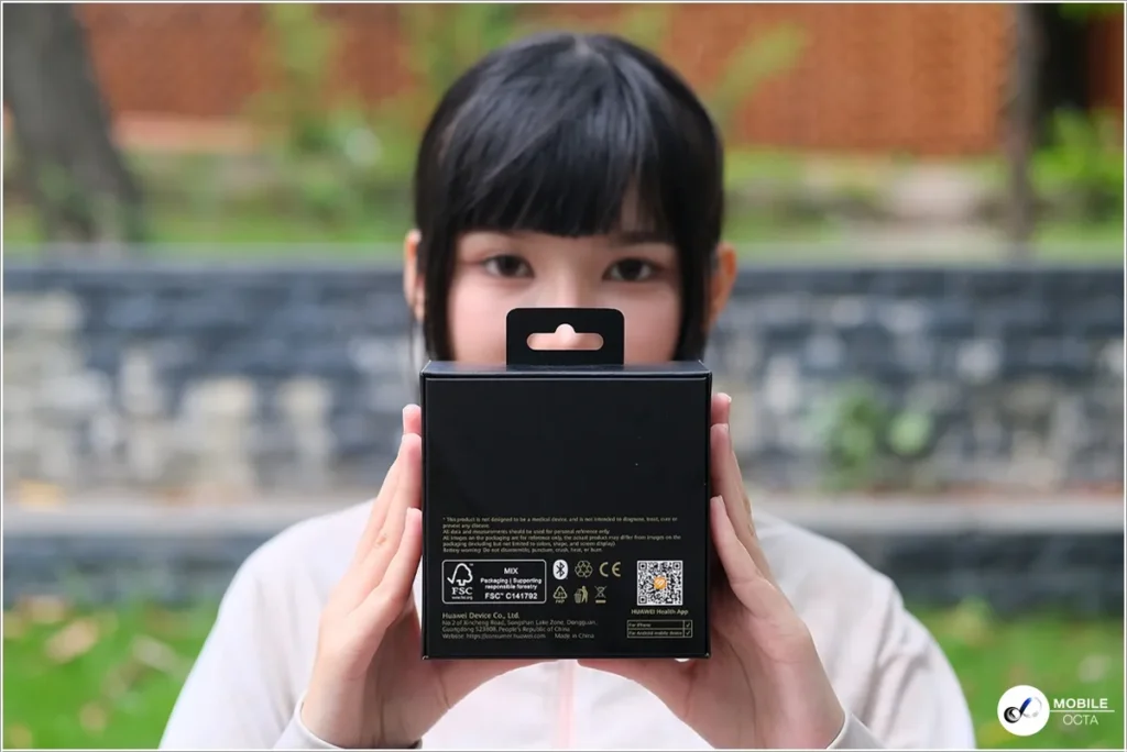 ส่วนด้านหลังกล่องมาพร้อมข้อมูลของผู้ผลิต และ QR Code สำหรับดาวน์โหลดแอป HUAWEI Health App