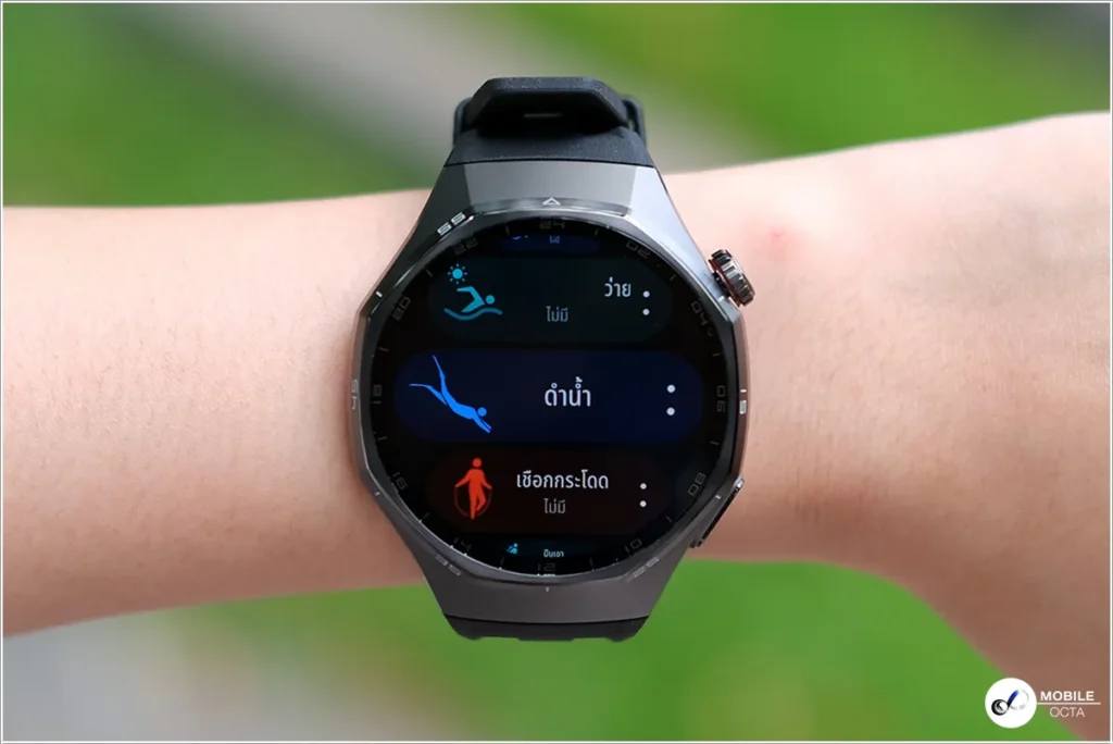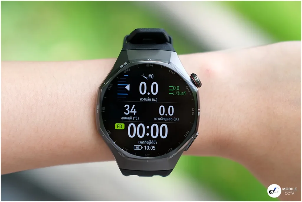 โดยในโหมดดำน้ำ HUAWEI WATCH GT 6 Pro จะให้ข้อมูลต่าง ๆ ที่สําคัญบนหน้าจอ เช่น ความลึก, ความเร็ว, อุณหภูมิ, ระยะเวลา และยังช่วยวิเคราะห์หลังจากดำน้ำ ช่วยให้ผู้ใช้งานประเมินประสิทธิภาพในการดำน้ำแต่ละครั้ง และยังมีฟีเจอร์ Hover Timer สำหรับฝึกเทคนิคการหยุดหายใจแบบคงที่และแบบไดนามิกได้