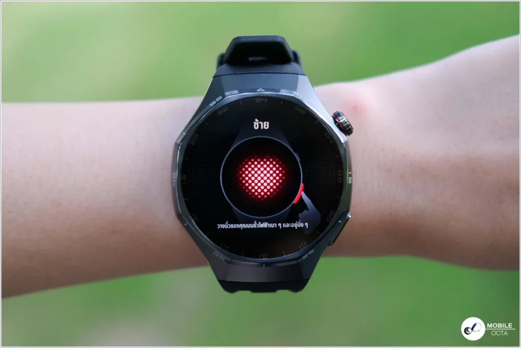 HUAWEI WATCH GT 6 Pro รองรับการวัดคลื่นไฟฟ้าหัวใจ เพียงเข้าไปที่แอป ECG วางแขนที่สวมสมาร์ทวอทช์บนพื้นผิวราบเรียบ จากนั้นกดปุ่มด้านข้าง (ใต้ปุ่มเม็ดมะยม) เพื่อเริ่มการวัด ระหว่างการวัดค่าแขนที่สวมสมาร์ทวอทช์ควรอยู่นิ่ง เลี่ยงการพูดคุย และหายใจได้ตามปกติ