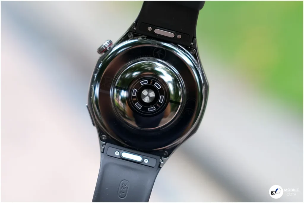 ส่วนด้านหลังใช้วัสดุเซรามิกนาโนคริสตัล พร้อมติดตั้งเซ็นเซอร์ต่าง ๆ ที่เอาไว้ใช้วัดอัตราการเต้นของหัวใจ ค่าออกซิเจนในเลือด อุณหภูมิของผิวหนัง สุขภาวะทางอารมณ์ ค่าความเครียด รวมถึงคุณภาพการหลับ และมีแม่เหล็กสำหรับเชื่อมต่อกับแท่นชาร์จแบบไร้สาย