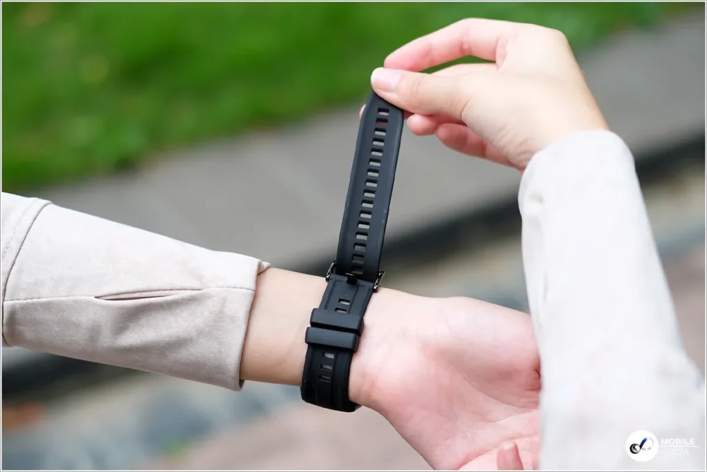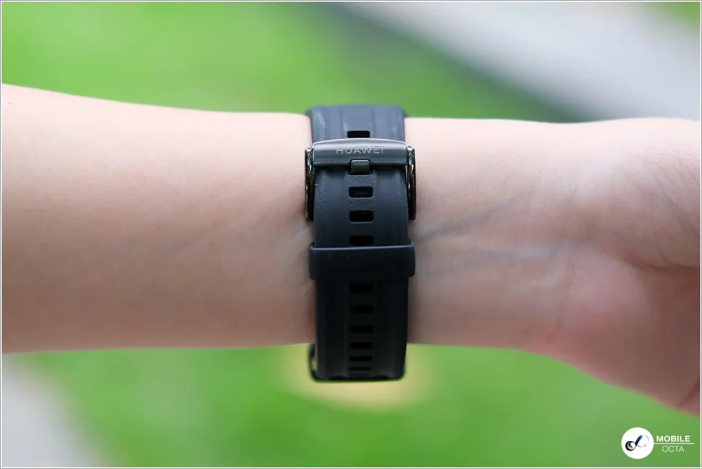 HUAWEI WATCH GT 6 Pro สีดำมาพร้อมสายรัดฟลูโอโรอีลาสโตเมอร์ ซึ่งทำจากวัสดุสังเคราะห์ที่มีความทนทาน นุ่มสบาย และใช้งานได้ยาวนาน เหมาะสำหรับการสวมใส่ในชีวิตประจำวันและขณะออกกำลังกาย โดยสายมีความกว้าง 22 มม. และความยาวรอบข้อมือ 140 – 210 มม.