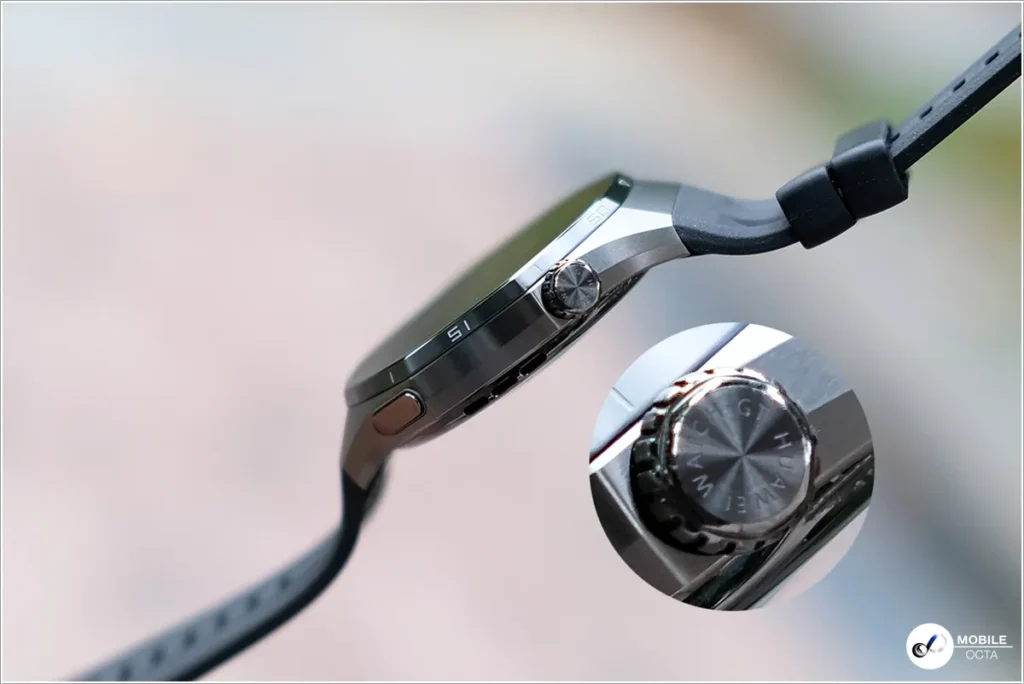 ขอบตัวเรือนมีความบาง 11.25 มม. โดยด้านขวาข้างตัวเรือน มีปุ่มกด 2 ปุ่มด้วยกัน โดยด้านบนเป็นปุ่มเม็ดมะยมแบบหมุนได้ และใช้เป็นปุ่มโฮม (Rotating Crown) ส่วนด้านล่างจะเป็นปุ่มเข้าสู่โหมดการออกกำลังกายต่าง ๆ และสามารถใช้เป็นปุ่มอ่านค่า ECG ได้ด้วย และมีช่องลำโพงสำหรับฟังเพลงหรือเสียงสนทนาอยู่ด้านนี้ด้วย