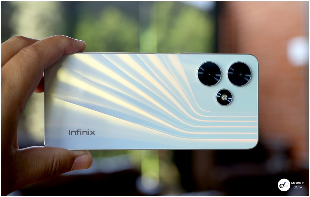 ดีไซน์ด้านหลังค่อนข้างโดดเด่นเช่นกัน โดยรุ่นที่เราได้มารีวิวนี้จะเป็นสีขาว Sonic White ที่มีลวดลายกราฟฟิกค่อนข้างสวยมากทีเดียว เมื่อเล่นกับแสงจะเป็นประกายริ้วสวยงามมาก ส่วนของกล้องรุ่นนี้จะมีกล้องคู่ครับ โดยมีส่วนกล้องนูนออกมาสองวงใหญ่ และมีวงเล็กเป็นไฟแฟลช LED 4 ดวงที่บอกเลยว่าสว่างตาแตกครับ ใช้เป็นไฟฉายได้ดีมากเลย ส่วนด้านล่างจะมีโลโก้ Infinix
