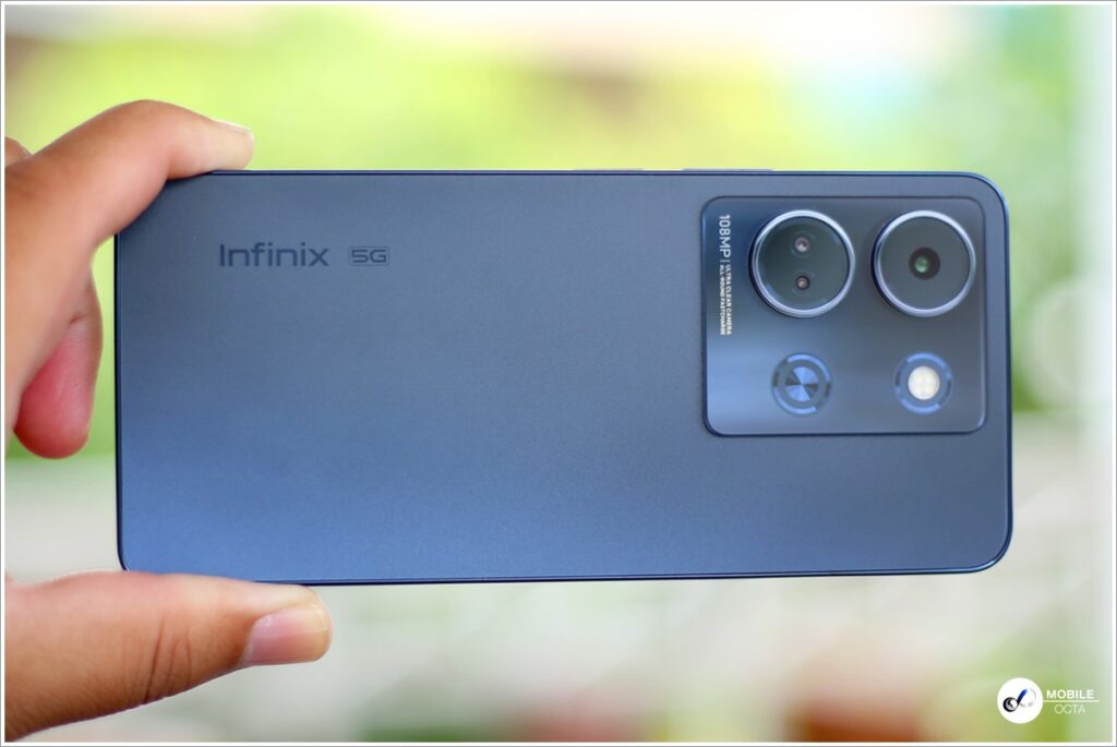 Infinix Note 30 5G มาพร้อมกล้องหลัง 3 ตัวครับ ประกอบด้วยกล้องหลัก 108 ล้านพิกเซล และกล้องเสริม 2MP อีก 2 ตัว คือกล้อง Depth และกล้อง AI และมีไฟแฟลชสำหรับถ่ายภาพในที่แสงน้อย