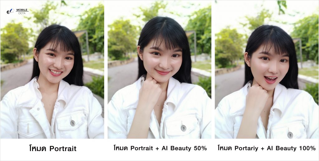 ภาพแรกถ่ายด้วยโหมดรูปคน (Portrait) และเปิดโบเก้ 60% ภาพที่สองถ่ายด้วยโหมดรูปคน พร้อมตั้งค่าเลือก AI Beauty 60% และเปิดโบเก้ 60% และภาพที่สามถ่ายด้วยโหมดรูปคน พร้อมตั้งค่าเลือก AI Beauty 100% และเปิดโบเก้ 60%