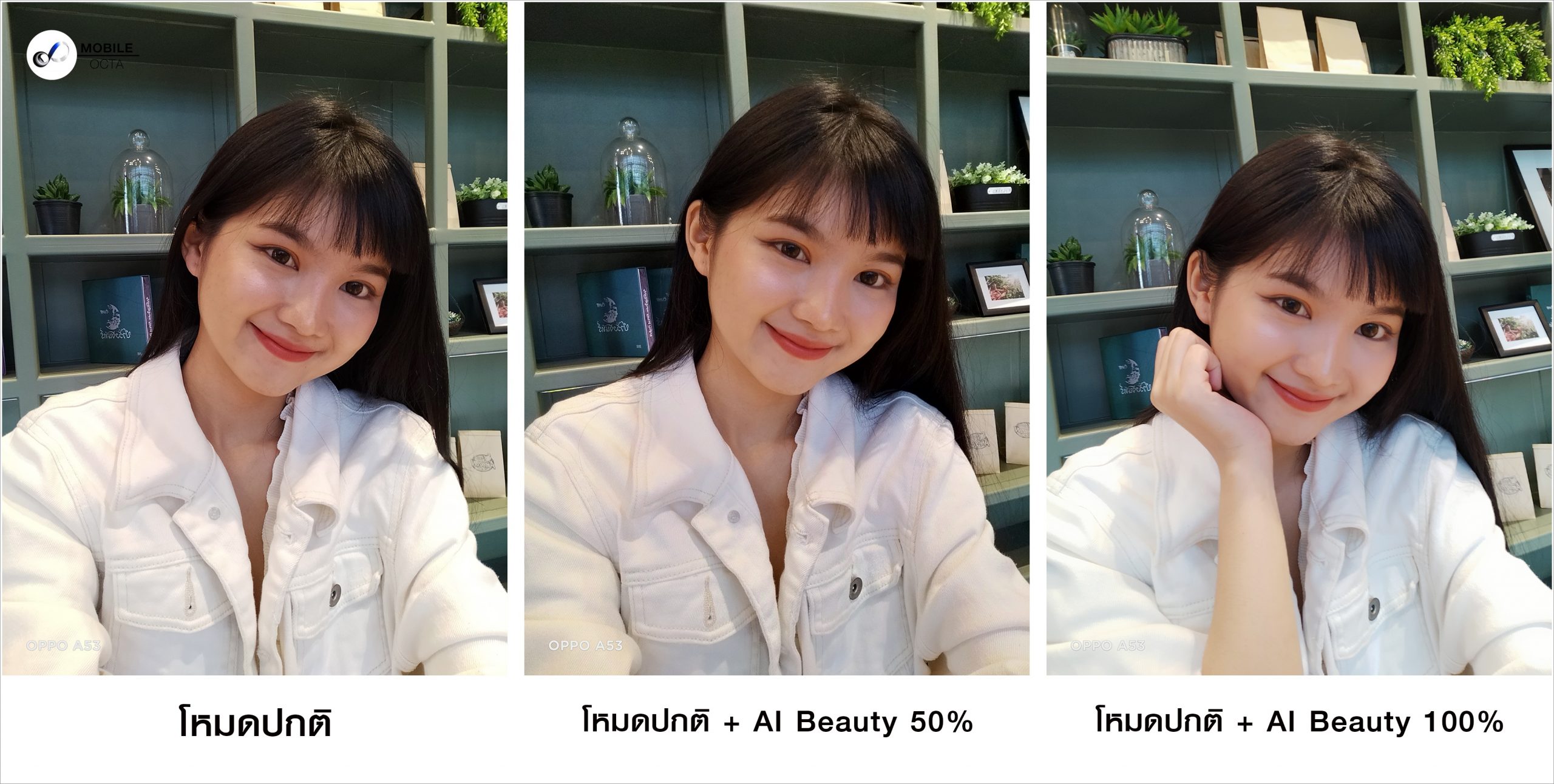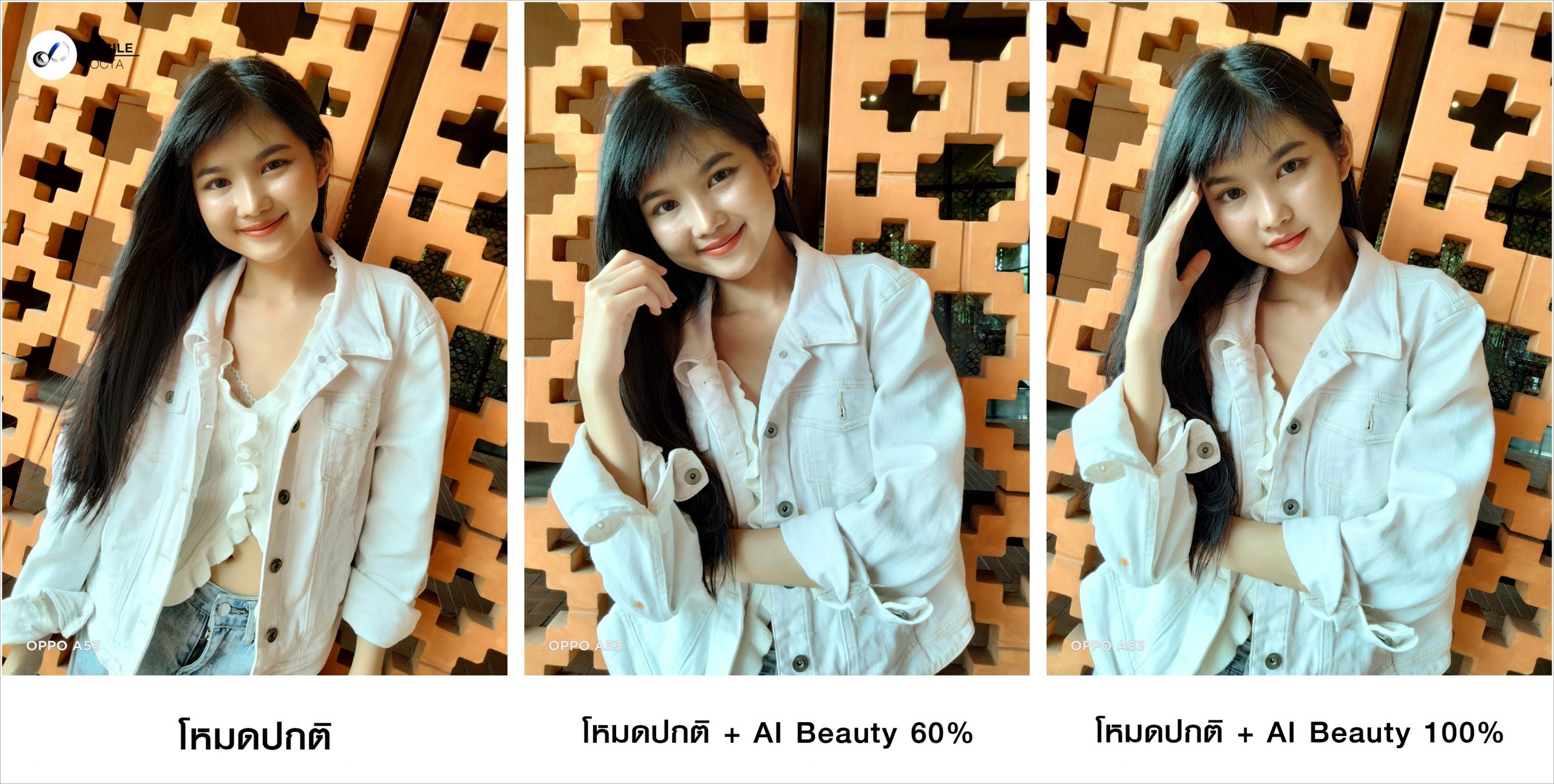 ภาพแรกถ่ายด้วยโหมดรูปถ่ายปกติ ภาพที่สองถ่ายด้วยโหมดรูปถ่ายปกติ พร้อมตั้งค่าเลือก AI Beauty 60% และภาพที่สามถ่ายด้วยโหมดรูปถ่ายปกติ พร้อมตั้งค่าเลือก AI Beauty 100%