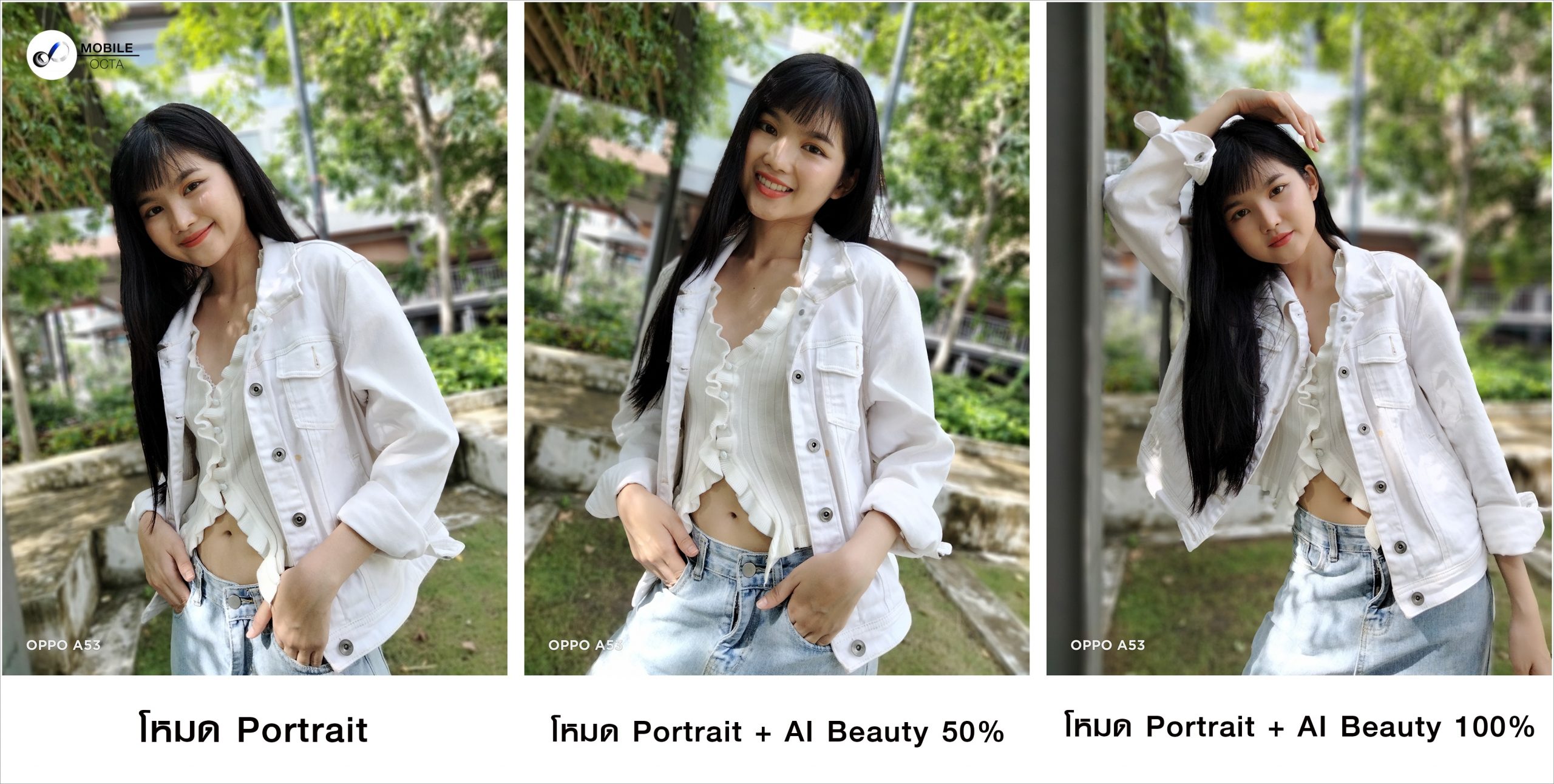 ภาพแรกถ่ายด้วยโหมดรูปคน (Portrait) และเปิดโบเก้ 60% ภาพที่สองถ่ายด้วยโหมดรูปคน พร้อมตั้งค่าเลือก AI Beauty 60% และเปิดโบเก้ 60% และภาพที่สามถ่ายด้วยโหมดรูปคน พร้อมตั้งค่าเลือก AI Beauty 100% และเปิดโบเก้ 60%