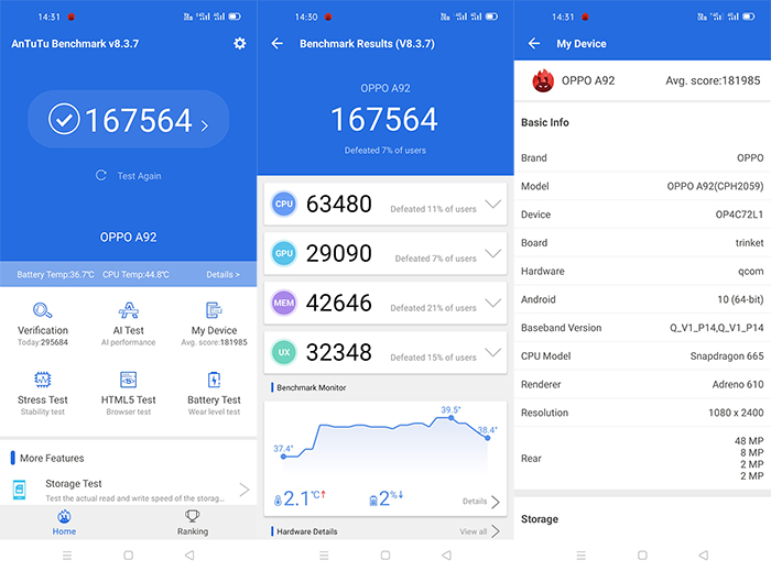 ผลการทดสอบประสิทธิภาพของ OPPO A92 ผ่านแอป Antutu