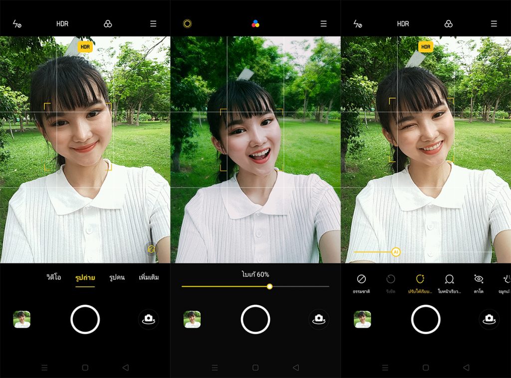 รวมทั้งรองรับเทคโนโลยี AI Beautification ที่ OPPO ได้พัฒนาขึ้นซึ่งสามารถเพิ่มประสิทธิภาพเซลฟี่ของคุณได้อย่างชาญฉลาด โดย AI Beautification สามารถตรวจจับพื้นผิวอายุเพศ และสีผิวโดยอัตโนมัติ และสร้างรูปแบบที่เหมาะสำหรับกลุ่มต่าง ๆ เพื่อให้คุณได้ภาพถ่ายที่สวยงามในแบบของตนเองโดยภาพนิ่งถ่ายได้ที่ความละเอียดสูงสุด 2448 x 3264 พิกเซล ส่วนวิดีโอบันทึกได้ที่ความละเอียดสูงสุด Full HD 1080p