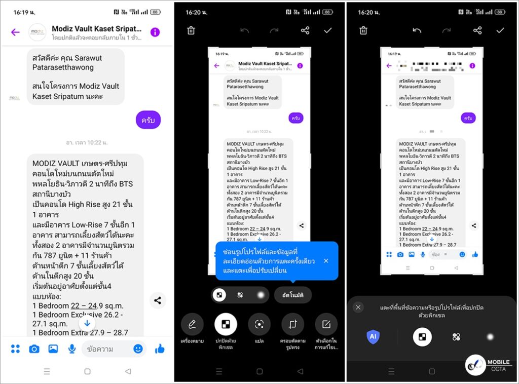 Auto Pixelate สามารถจดจำและทำการเบลอพิกเซลข้อมูลที่ละเอียดอ่อนโดยอัตโนมัติ เช่น รูปโปรไฟล์และชื่อบนภาพหน้าจอแชทของคุณด้วยการคลิกเพียงครั้งเดียว ช่วยประหยัดเวลาของคุณไม่ต้องซ่อนข้อมูลด้วยตัวเอง แชร์แชทของคุณกับเพื่อนๆ ได้ง่ายๆ โดยไม่ต้องกังวลว่าจะเปิดเผยข้อมูลส่วนตัวมากเกินไป