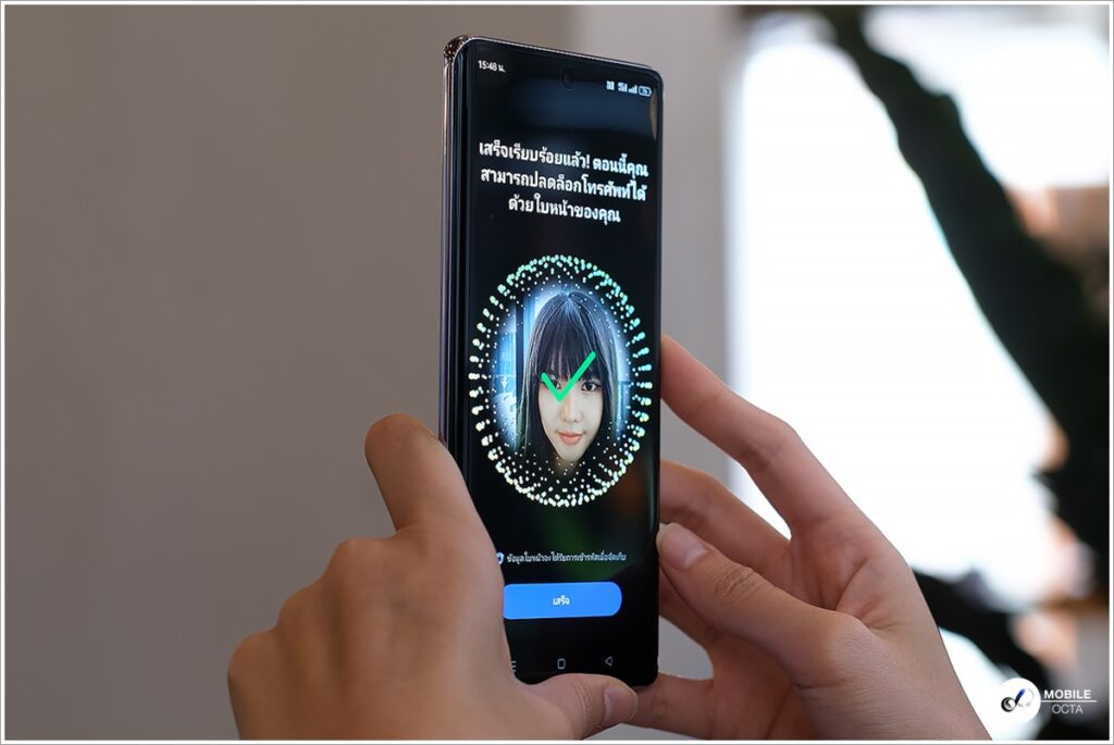 รองรับการปลดล็อคหน้าจอด้วยใบหน้า Face Unlock เพียงลงทะเบียนด้วยใบหน้า ซึ่งจะใช้ได้เพียงหน้าเดียวเท่านั้น จากนั้นเพียงแค่มองไปที่หน้าจอก็สามารถปลดล็อกได้แล้ว นอกจากนี้ ยังสามารถใช้ใบหน้าเพื่อเข้าสู่แอปที่ป้องกันไว้ หรือในพื้นที่ที่ต้องการความปลอดภัยได้