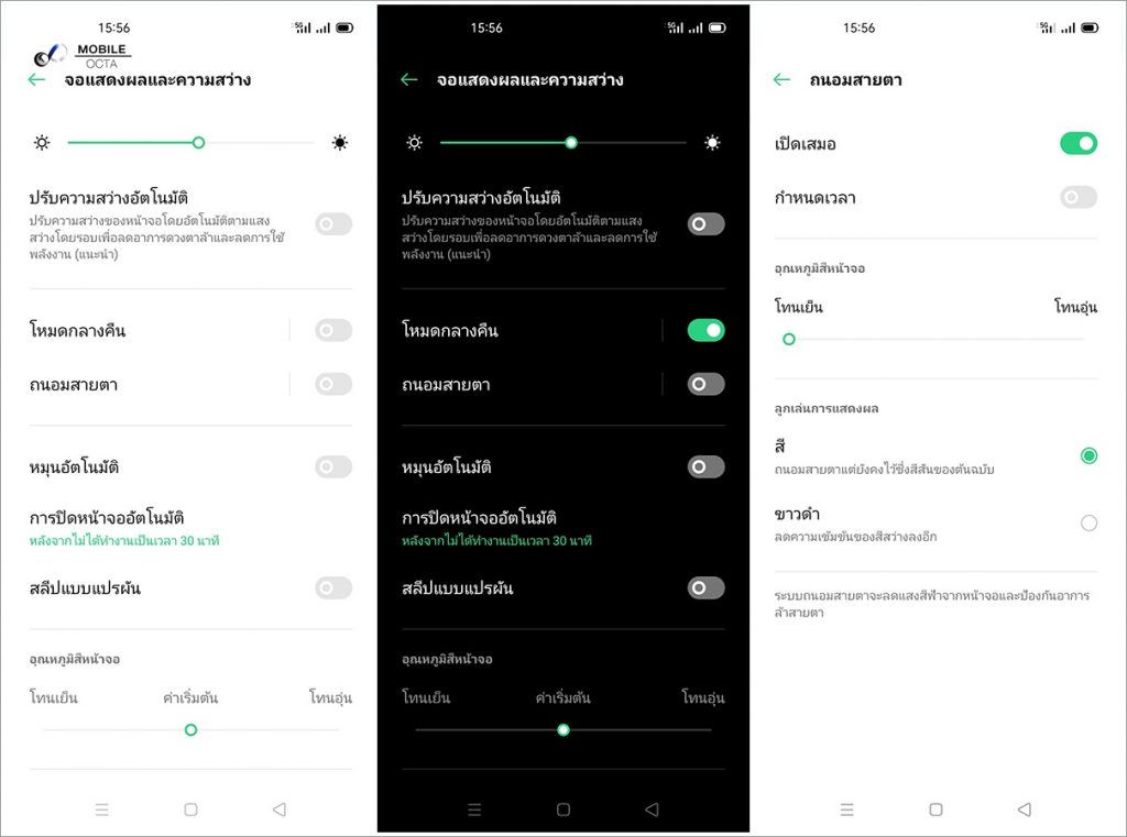 มาพร้อม Dark Mode สำหรับปรับสีของหน้า UI ให้อยู่ในโทนสีดำ เพื่อช่วยให้ใช้งานได้อย่างสบายตามากยิ่งขึ้น โดยเฉพาะการอ่านหนังสือ และยังทำให้เครื่องใช้พลังงานน้อยลงช่วยยืดอายุแบตเตอรี่ด้วย พร้อมกับโหมดถนอมสายตา ที่ได้รับการรับรองจาก Rheinland TÜV โดยมีอัตราการกรองแสงสีฟ้าได้มากกว่า 58% ช่วยถนอมสายตาได้ เป็นอย่างดี