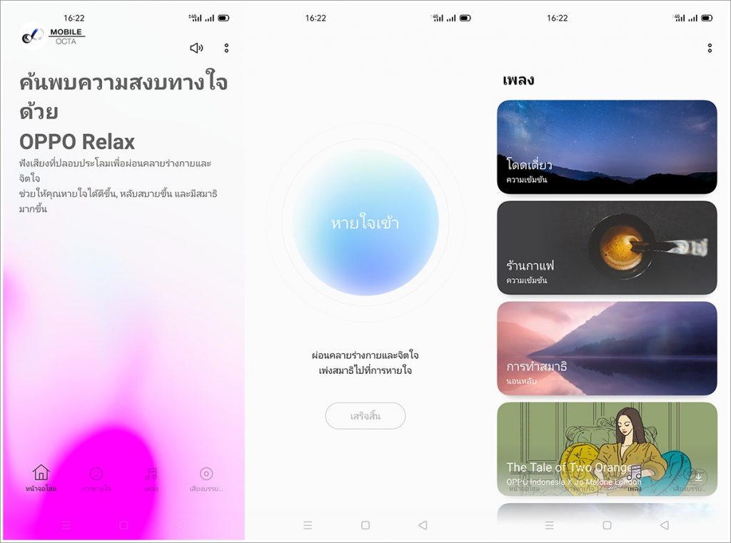 OPPO Relax แอปพลิเคชันที่ได้รับแรงบันดาลใจจากธรรมชาติและนำเสนอในแง่ของเสียง โดยมาพร้อมเสียงเพลงที่ช่วยให้ผู้ใช้ได้ผ่อนคลาย เหมาะสำหรับเปิดระหว่างเข้านอน, อ่านหนังสือ หรือต้องการทำสมาธิ