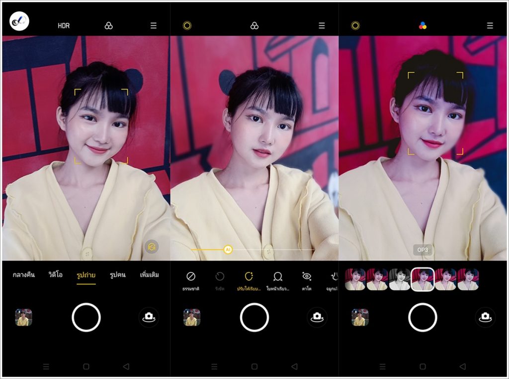 ภาพแรกถ่ายด้วยโหมดรูปถ่ายปกติ ภาพที่สองถ่ายด้วยโหมดรูปถ่ายปกติ พร้อมตั้งค่าเลือก AI Beauty 60% และภาพที่สามถ่ายด้วยโหมดรูปถ่ายปกติ พร้อมตั้งค่าเลือก AI Beauty 100%
