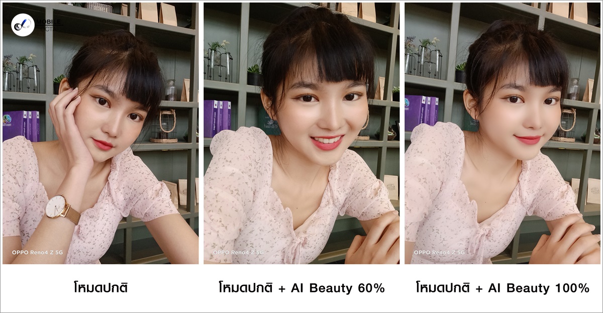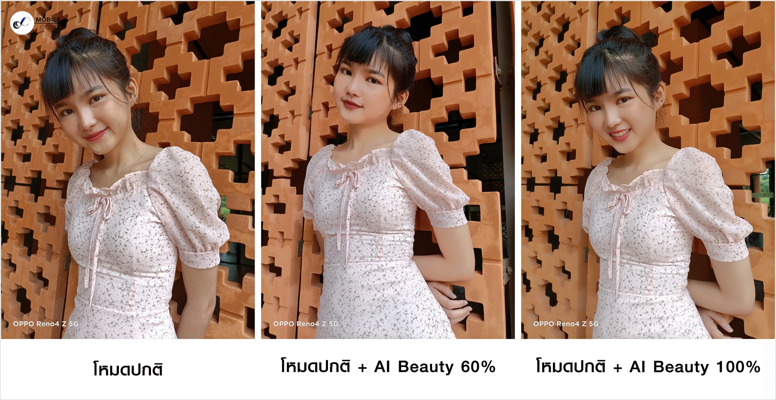 ภาพแรกถ่ายด้วยโหมดรูปถ่ายปกติ ภาพที่สองถ่ายด้วยโหมดรูปถ่ายปกติ พร้อมตั้งค่าเลือก AI Beauty 60% และภาพที่สามถ่ายด้วยโหมดรูปถ่ายปกติ พร้อมตั้งค่าเลือก AI Beauty 100%