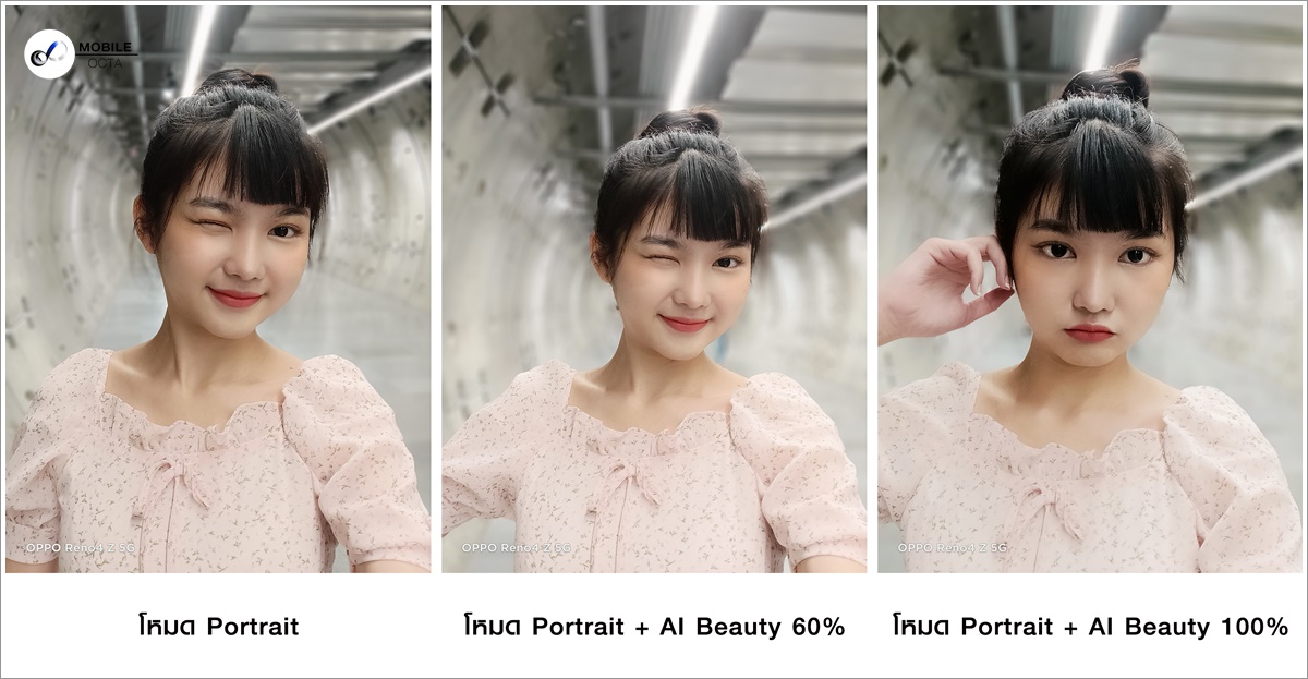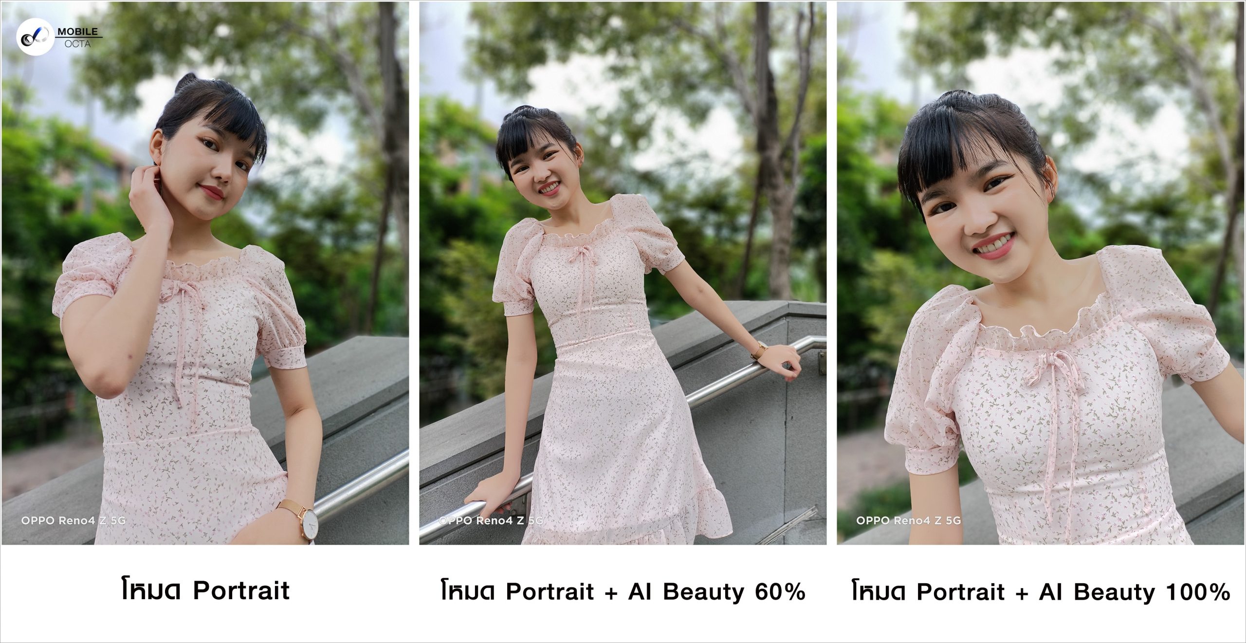 ภาพแรกถ่ายด้วยโหมดรูปคน (Portrait) และเปิดโบเก้ 60% ภาพที่สองถ่ายด้วยโหมดรูปคน พร้อมตั้งค่าเลือก AI Beauty 60% และเปิดโบเก้ 60% และภาพที่สามถ่ายด้วยโหมดรูปคน พร้อมตั้งค่าเลือก AI Beauty 100% และเปิดโบเก้ 60%