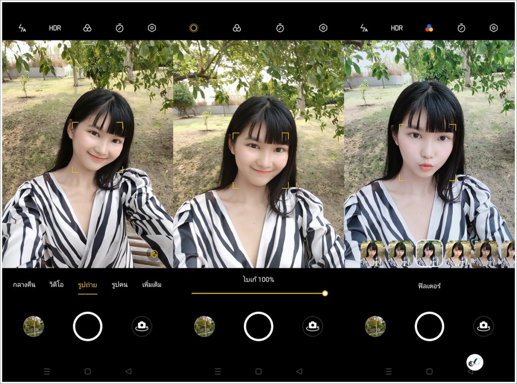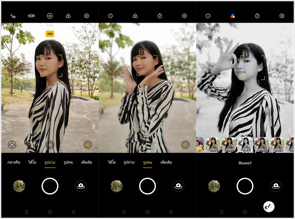 ภาพถ่ายด้วยโหมดรูปถ่ายปกติ พร้อมตั้งค่าเลือก AI Beauty 60% และเลือกฟิลเตอร์ที่มีให้เลือกถึง 16 แบบ