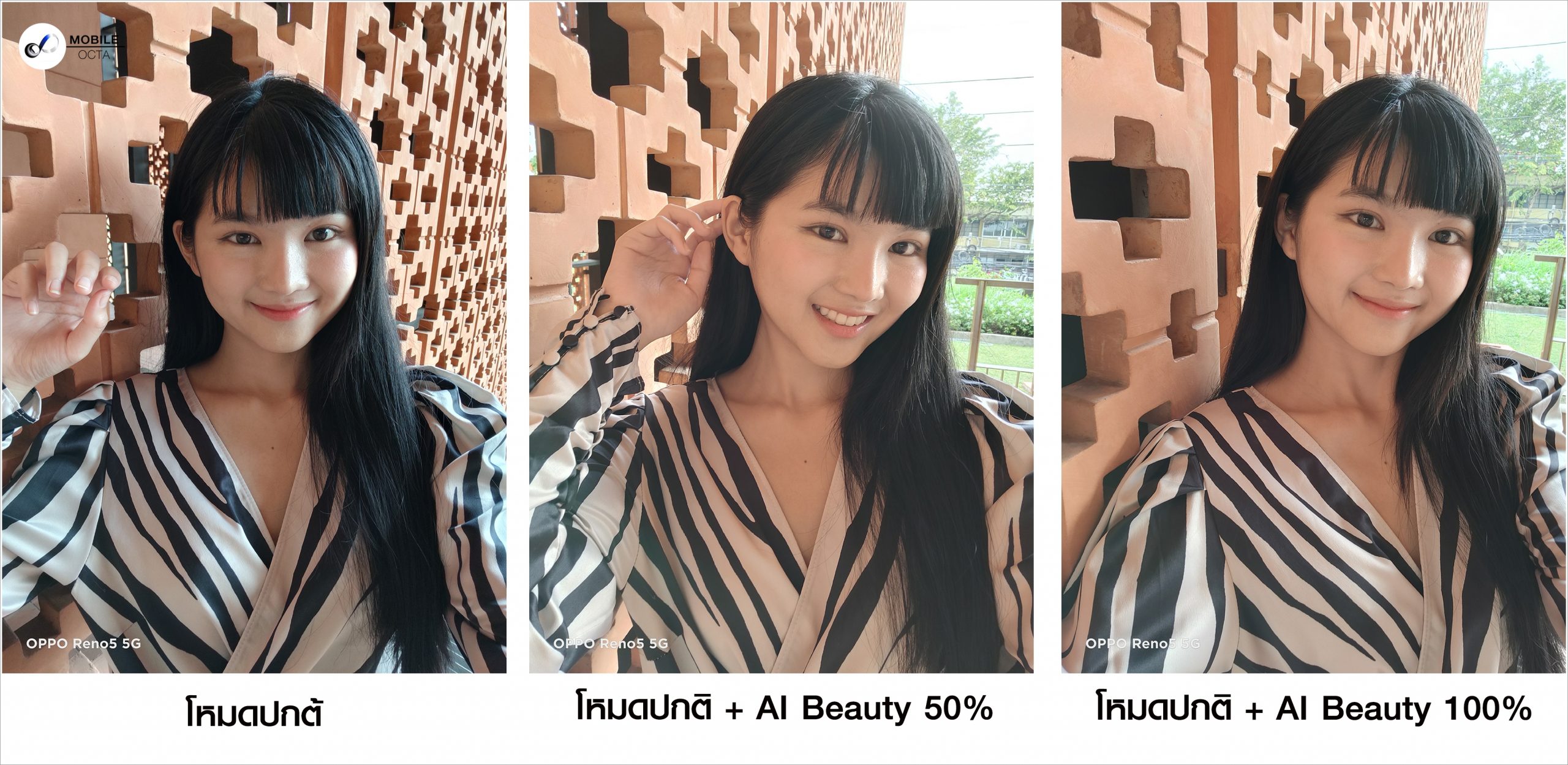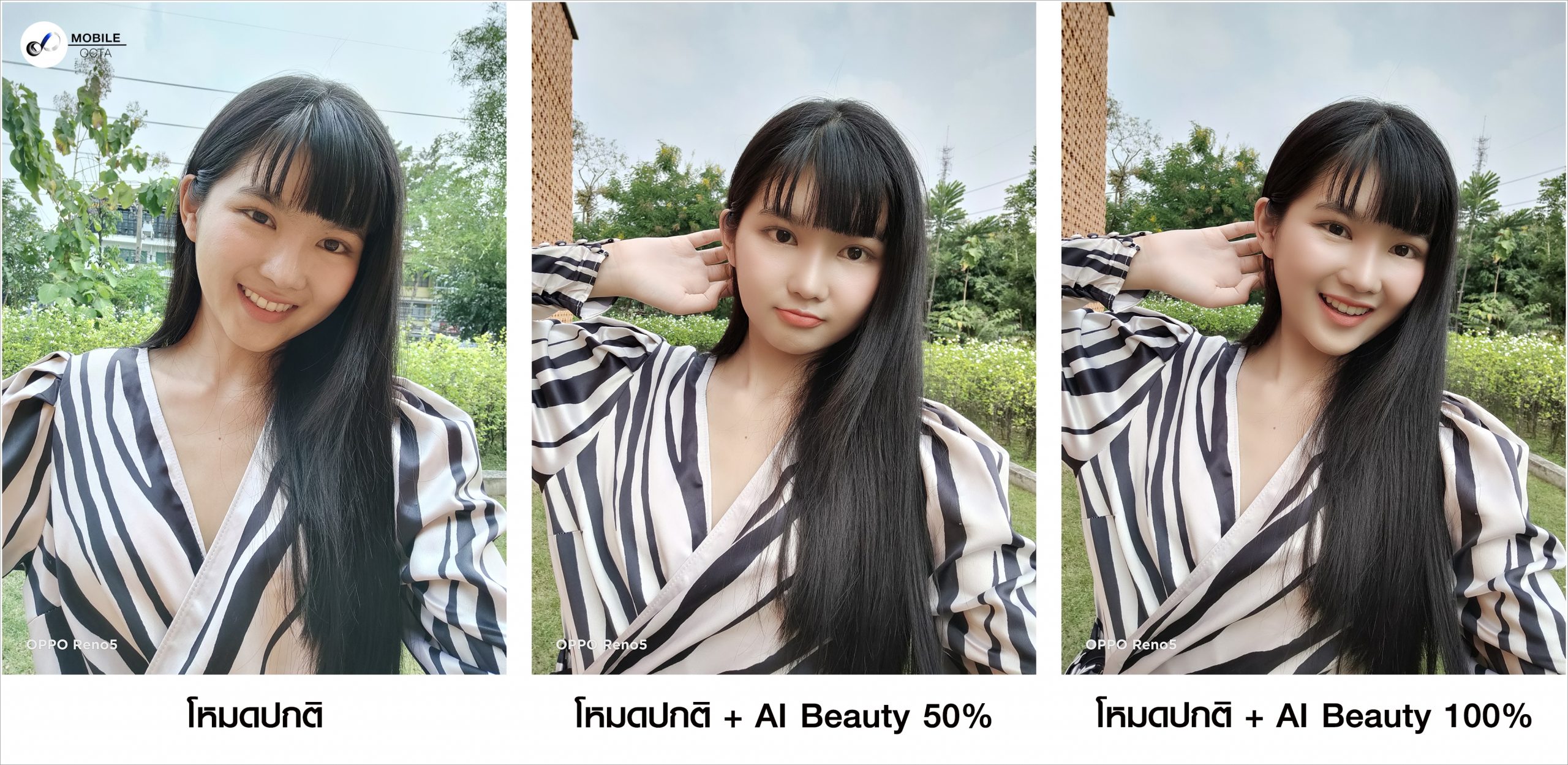 ภาพแรกถ่ายด้วยโหมดรูปถ่ายปกติ ภาพที่สองถ่ายด้วยโหมดรูปถ่ายปกติ พร้อมตั้งค่าเลือก AI Beauty 50% และภาพที่สามถ่ายด้วยโหมดรูปถ่ายปกติ พร้อมตั้งค่าเลือก AI Beauty 100%