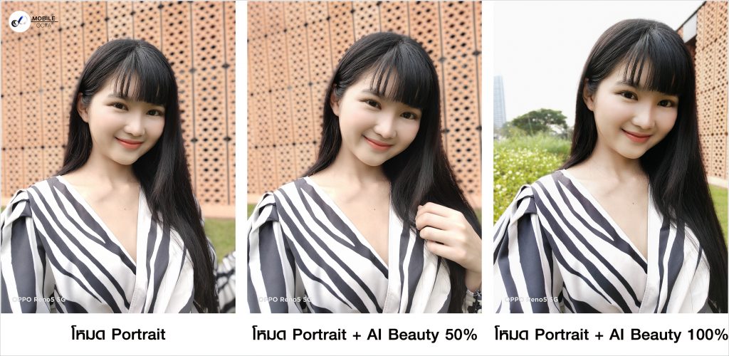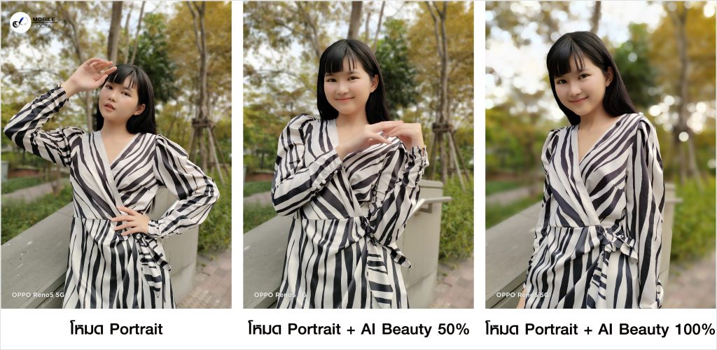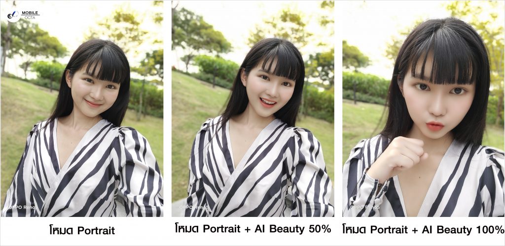 ภาพแรกถ่ายด้วยโหมดรูปคน (Portrait) และเปิดโบเก้ 60% ภาพที่สองถ่ายด้วยโหมดรูปคน พร้อมตั้งค่าเลือก AI Beauty 50% และเปิดโบเก้ 60% และภาพที่สามถ่ายด้วยโหมดรูปคน พร้อมตั้งค่าเลือก AI Beauty 100% และเปิดโบเก้ 60%
