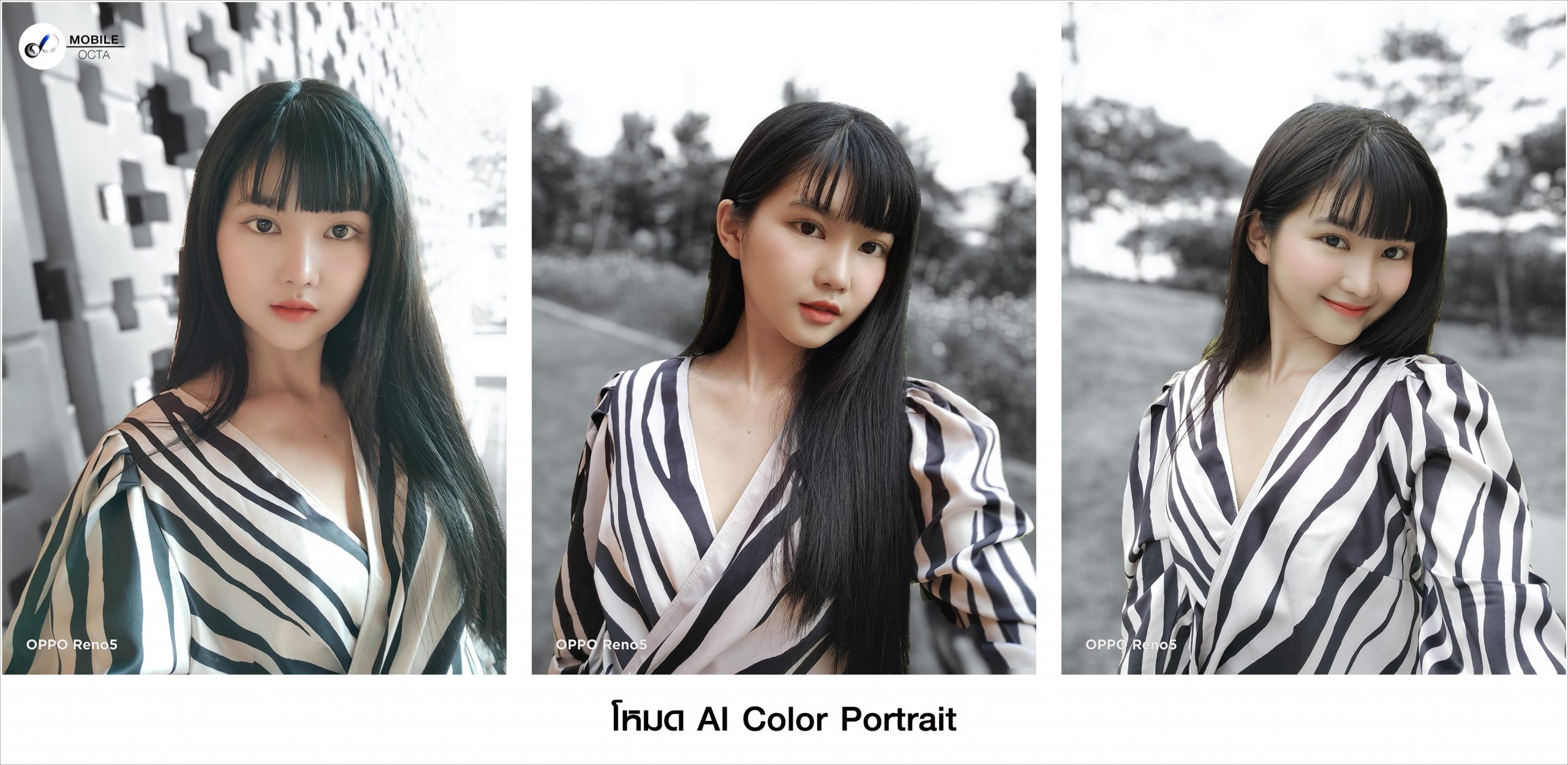 ภาพถ่ายด้วยโหมด Portrait เลือกฟิลเตอร์ AI Color Portrait ที่ช่วยเปลี่ยนฉากหลังให้เป็นขาว-ดำ แต่ยังคงภาพสีให้กับตัวบุคคล ทำให้ได้ภาพ Portrait ที่โดดเด่นสะดุดตาอีกรูปแบบ สามารถใช้ได้ทั้งกล้องหลังและกล้องหน้า และมีเฉพาะใน OPPO Reno5 เท่านั้น